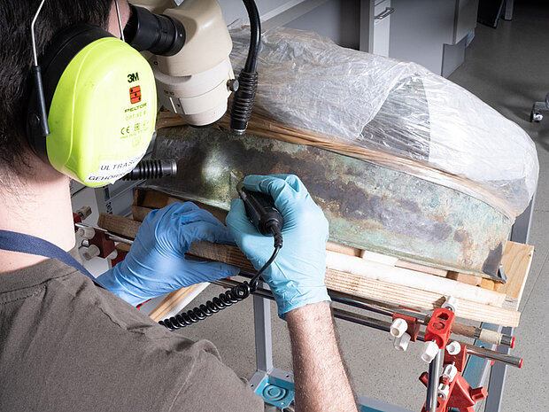 One of the central tasks of the Bavarian State Archaeological Collection is to prevent finds from deteriorating and to prepare them for academic investigations or museum presentation. The State Collection also carries out authenticity tests on artefacts whose age or character is unclear. The Archaeological Conservation department, the largest facility of its kind in southern Germany, works in material-specific studios on Oettingenstraße in Munich. Basic materials research into the properties of prehistoric and early historical materials and current methods of conserving and restoring archaeological finds are part of the remit of a team of around a dozen conservators.